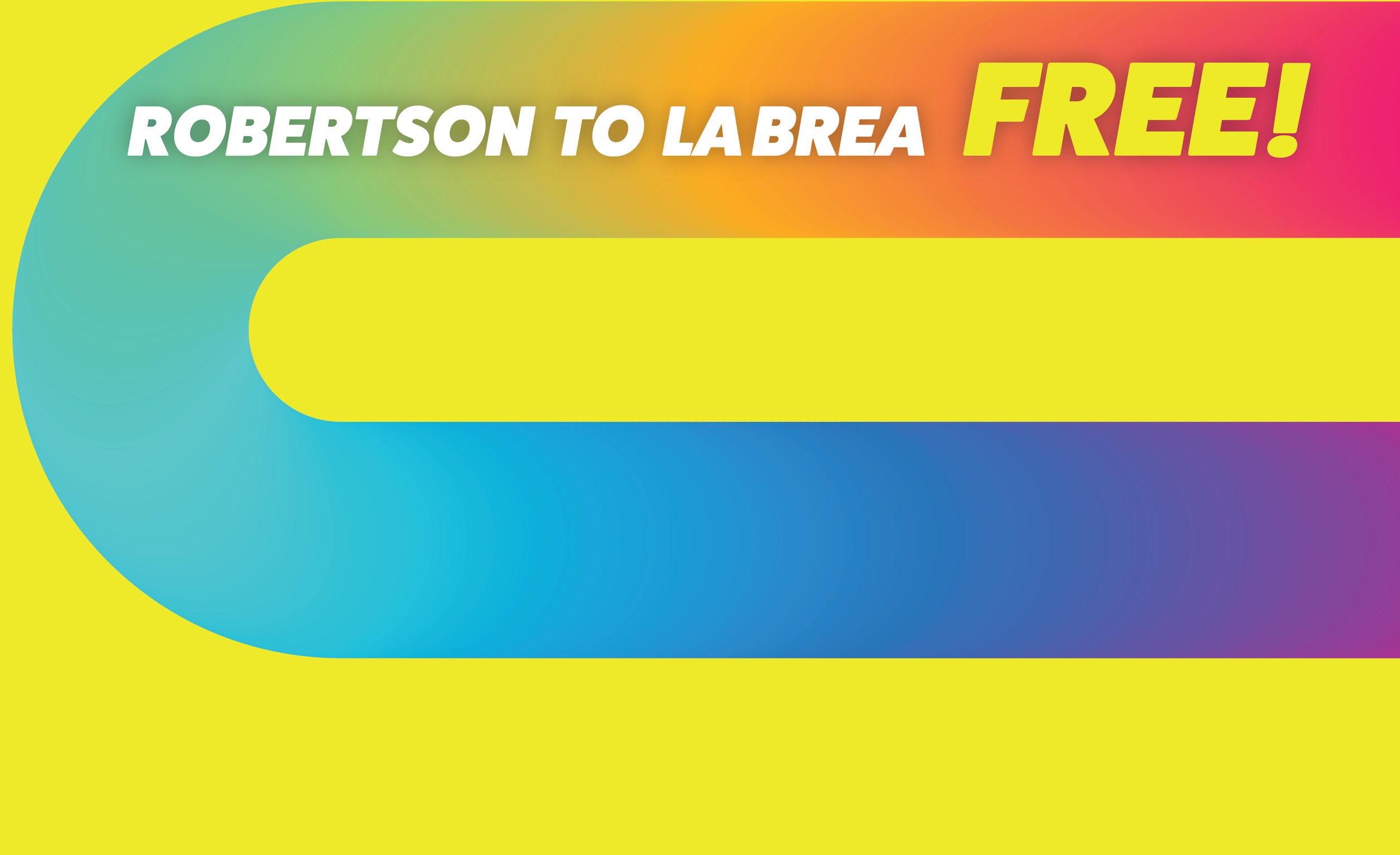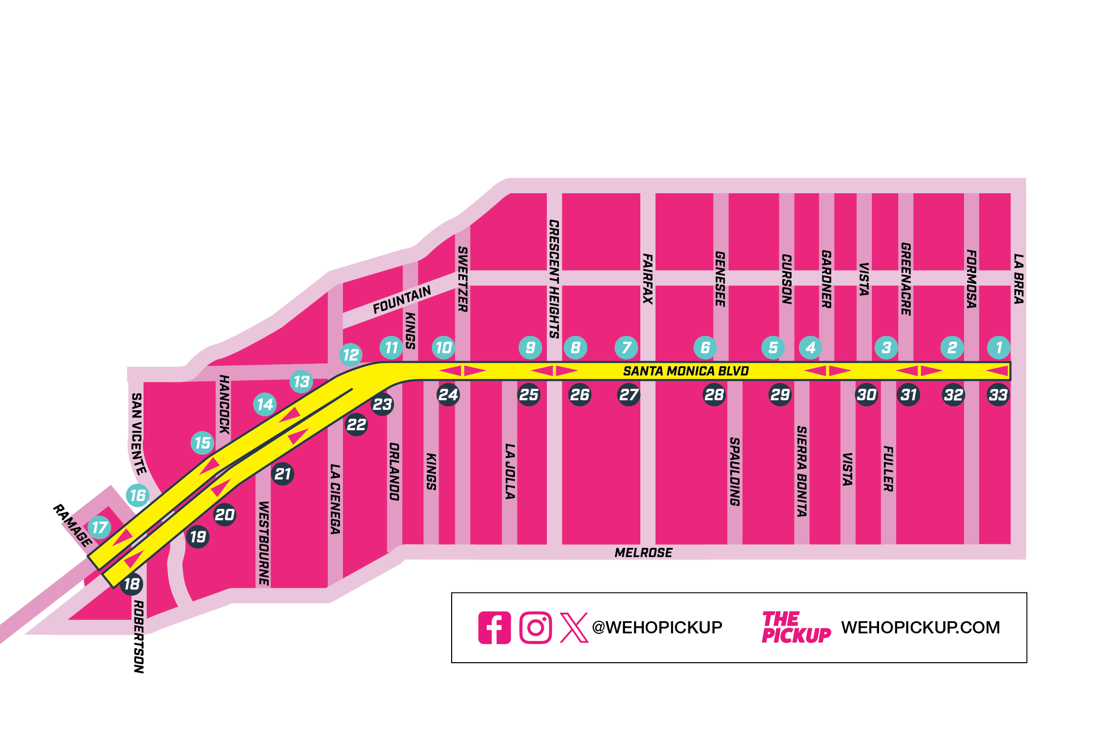 The PickUp is a six-mile long loop with stops every two to three blocks along Santa Monica Boulevard between Robertson and La Brea! Click here to find a stop near you or look for the brightly colored yellow signs when you are out on Santa Monica Boulevard.